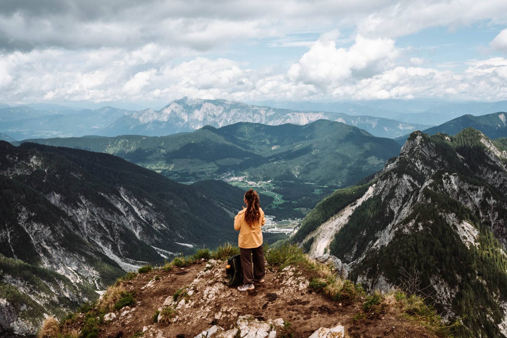 At the cozy mountain hut Erjavčeva Koča, about 35 kilometers (21.7 miles) northwest of Bovec, you’ll find the starting point of the hike to Slemenova Špica. This trail takes you through a variety of landscapes, with ever-changing views along the way. At the summit, a stunning viewpoint rewards you with sweeping mountain panoramas—and on clear days, you can even see the peaks of Austria and Italy. It’s absolutely worth the climb. The hike takes around 1.5 to 2 hours up and about 1.5 hours down. We chose to hike up via the Vršič Trail and descend via the Mala Mojstrovka Trail, creating a loop so you don’t have to take the same route twice.