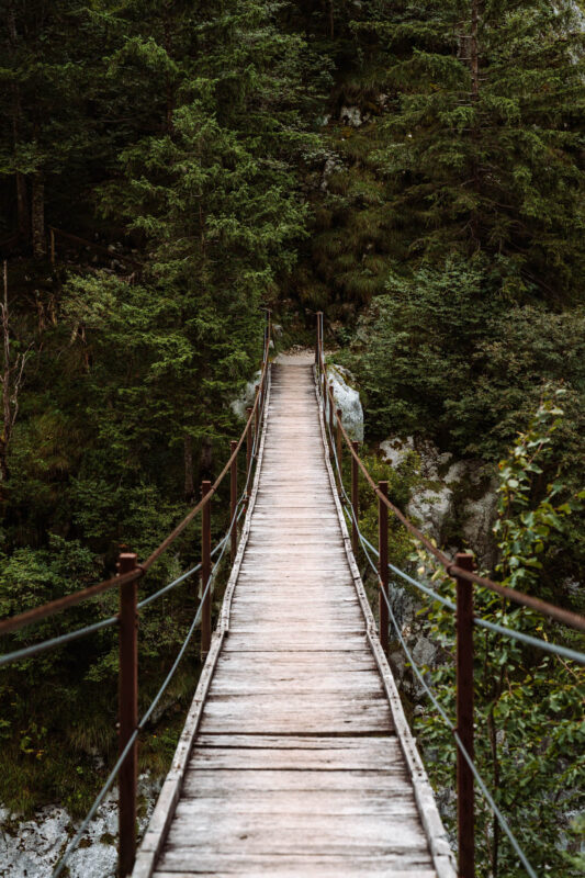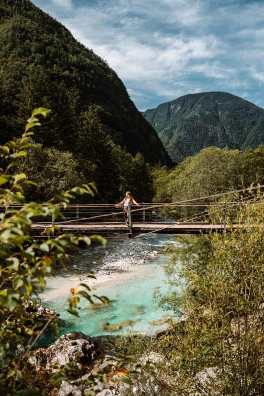 The Soča Trail is one of the most beautiful hikes in Slovenia. This route follows the emerald-green Soča River, taking you through dense forests, mountain meadows, and impressive gorges. Along the way, you’ll pass small waterfalls and farms, cross multiple suspension bridges, and enjoy endless views of the Julian Alps. Our favorite spot was this suspension bridge, which felt extra special in the rugged landscape.