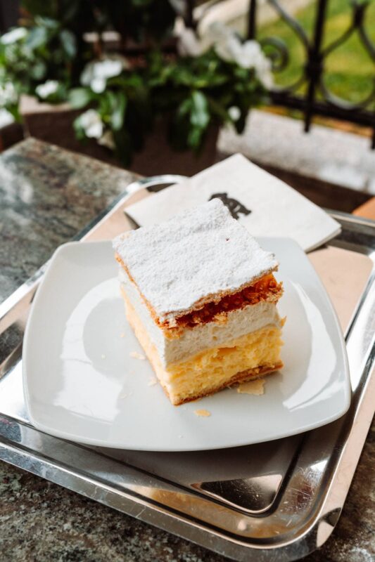 A visit to Lake Bled isn’t complete without tasting the famous Bled Cream Cake (Blejska kremšnita). This light dessert is made with layers of flaky puff pastry, creamy vanilla custard, whipped cream, and a dusting of powdered sugar. It’s the town’s signature treat and a must for anyone with a sweet tooth. One of the best places to try the authentic Bled Cake is at Slascicarna Zima, a charming café near the lake that has been making it for decades following a traditional recipe — light, creamy, and fresh. Delicious!