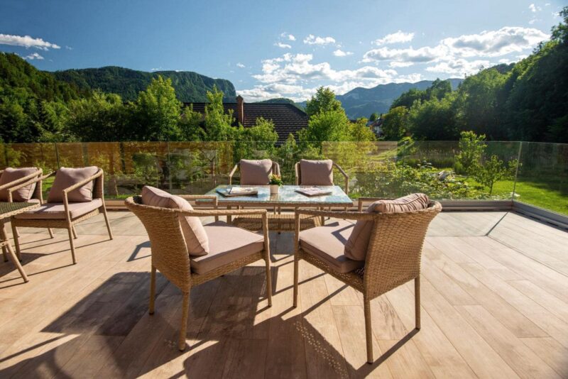 Hidden among the greenery around Bled are several beautiful glamping sites that make for a truly special stay. Our favorite is the luxurious Ribno Alpine Glamping. Nestled among the trees, you’ll find eight cozy wooden cabins, each named after a Slovenian flower. Every cabin is charmingly decorated, but the real showstopper is the private hot tub on the veranda — perfect for soaking while enjoying the peaceful forest views. There’s also an outdoor pool for warm summer days and a large sauna overlooking the garden for cooler evenings.