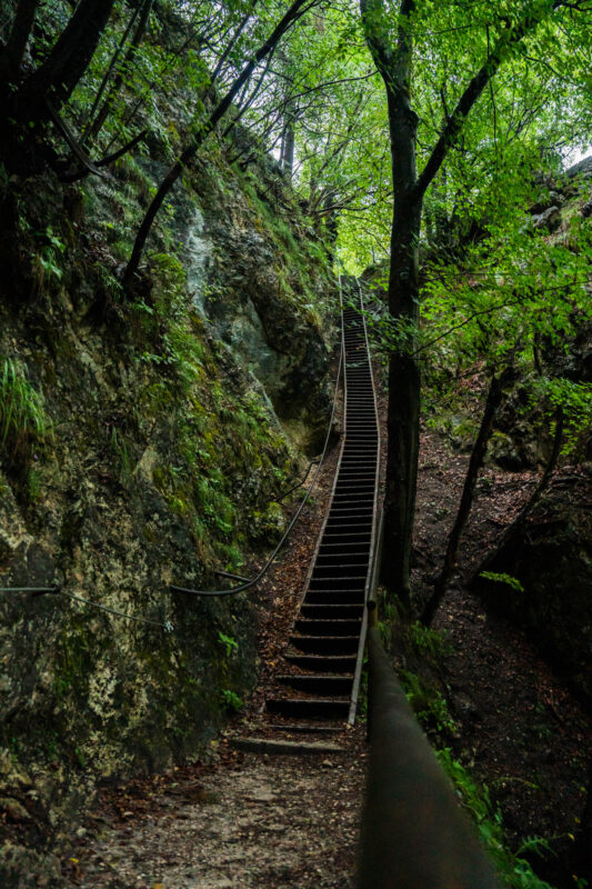 The walk through the gorge takes about 45 minutes. The first section is dramatic, with rushing water, narrow passages, and glowing blue tones on sunny days. In mist or rain, the atmosphere feels almost mystical. As you go further, the river slows and quiets. At the end, you’ll find a small restaurant with a terrace and a hanging bridge. From here, walk down to the Slap Šum waterfall. For the return, you have two options: the shorter River of Trees Trail (4.3 kilometers / 2.7 miles, about 2 hours) through the forest, or the longer King of Triglav Trail (5.7 kilometers / 3.5 miles, about 2.5 hours) passing St. Catherine’s Church and scenic viewpoints.
