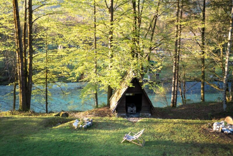 Located on the quiet western side of Lake Bohinj, far from the crowds, TUBA Apartments is a hidden gem. The property sits right along the Sava River and features a large garden where you can build a campfire in the evening. You’ll stay in a cozy apartment equipped with a small kitchenette, a comfortable bed, and a modern bathroom. The shared lounge areas are warm and welcoming, complete with a wood-burning stove for chilly evenings.