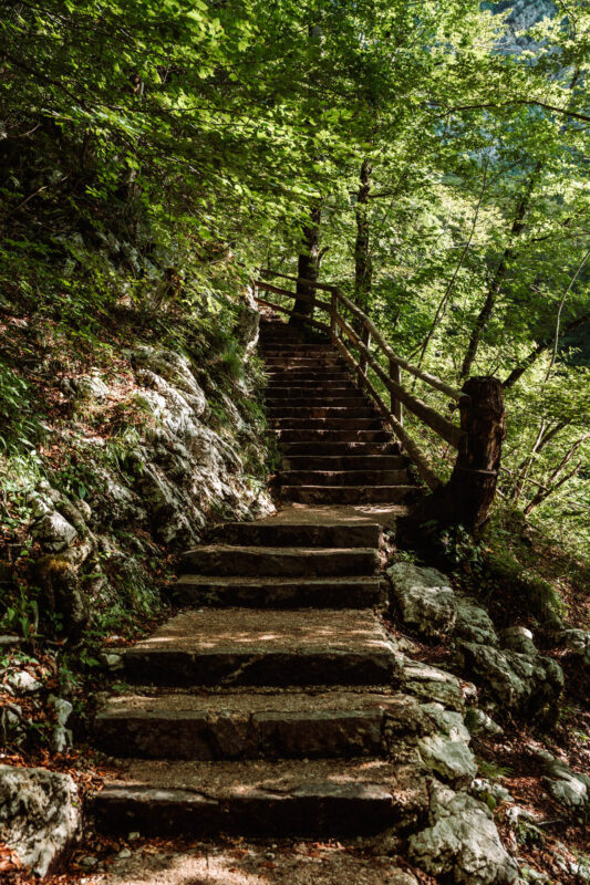 If you love hiking, don’t miss the trail through Mostnica Gorge. Starting in the village of Stara Fužina, the path follows the turquoise river and winds past impressive gorges, wooden bridges, and rock formations. Eventually, the landscape opens into the Voje Valley — a peaceful green meadow dotted with mountain huts and surrounded by peaks. The full trail is about 15 kilometers (9.3 miles) long, and along the way you can stop at a cozy mountain hut that serves some of the best homemade apple strudel. It’s the perfect spot for a lunch break with a view!