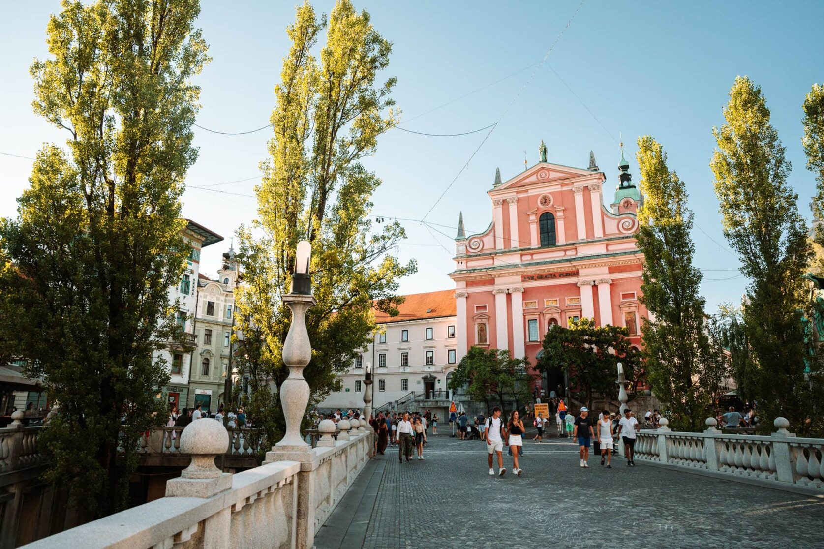 Right on Prešeren Square, one building immediately catches your eye: the Franciscan Monastery with its striking pink façade. The monastery dates back to 1233 and is full of history. Inside, you’ll find colorful frescoes, marble details, and an impressive library filled with centuries-old manuscripts. The monastery sits right next to the famous Triple Bridge, so it’s hard to miss. While the square outside buzzes with people and café terraces, stepping inside feels like entering a peaceful, almost sacred space.